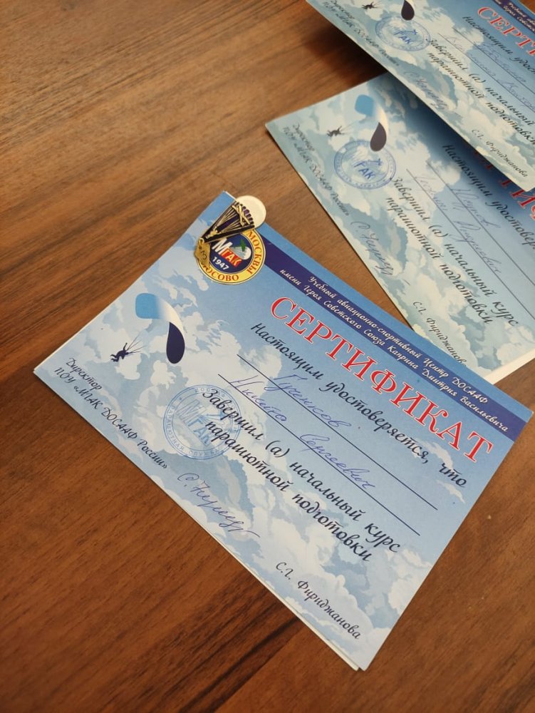 В рамках мероприятия кадетам, завершившим начальный курс парашютной подготовки, были вручены знаки "Парашютист" и сертификаты.