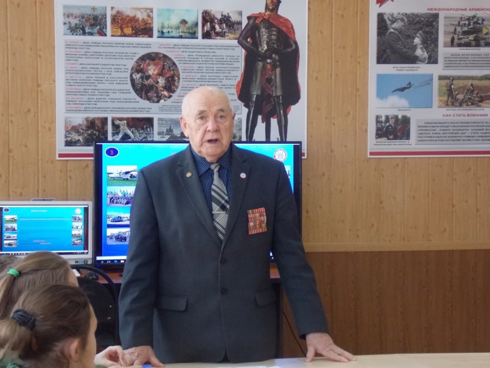 Беседу о истории ОСОАВИАХИМ - ДОСААФ провел ветеран Вооруженных сил, почетный работник ДОСААФ Тарасов Владимир Павлович.