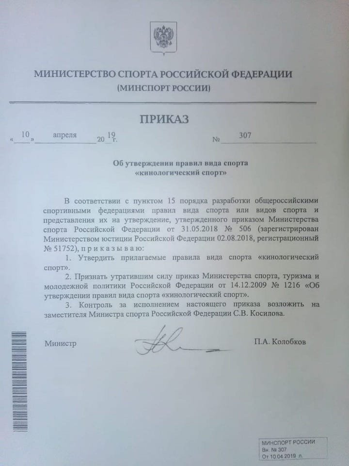 19 апр.10 апреля министром спорта РФ подписан приказ № 309, об утверждении новых правил кинологического спорта. Это знаменательное событие, так впервые в истории современного кинологического спорта России появилась новая дисциплина: «летний биатлон».