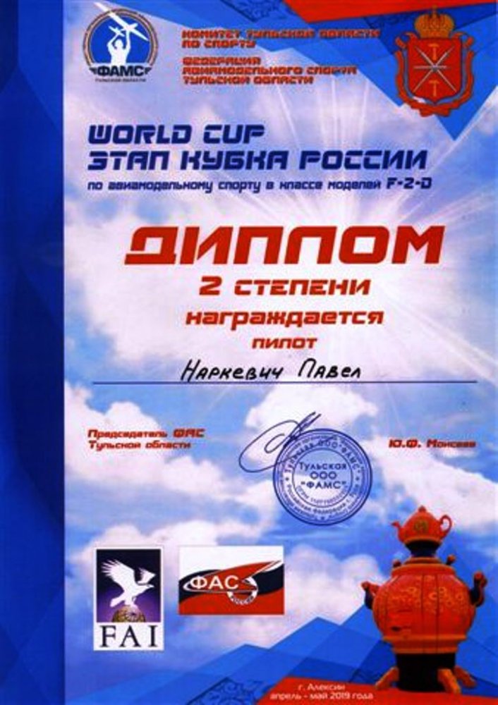 3 маяС 30 апреля по 3 мая 2019 г. в г. Алексин Тульской области состоялись крупнейшие, рейтинговые, отборочные международные соревнования - Этап Кубка Мира, России, Европы и Азии по авиамодельному спорту в которых приняли участие 98 экипажей из многих городов и регионов России, стран ближнего и дальнего зарубежья: Москвы, Санкт Петербурга, Тольятти, Самары, Нижнего Новгорода, Брянска, Тулы, Ставрополя, Приморского края, Калуги, Смоленска, Саратова, Алексина, Химок, Подольска, Воскресенска, Жуковского, Сергиева Посада, Ростовской области, Ставрополя, Волгограда, Республики Коми, Республики Башкортостан, Краснодарского края, Вологды, Болгарии, Белоруссии, Испании.