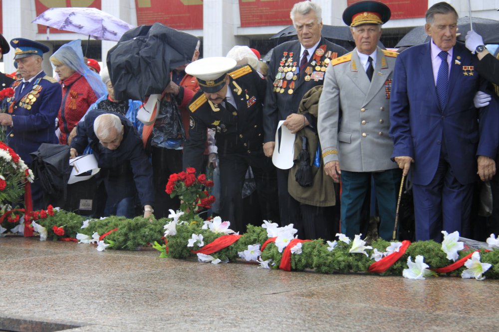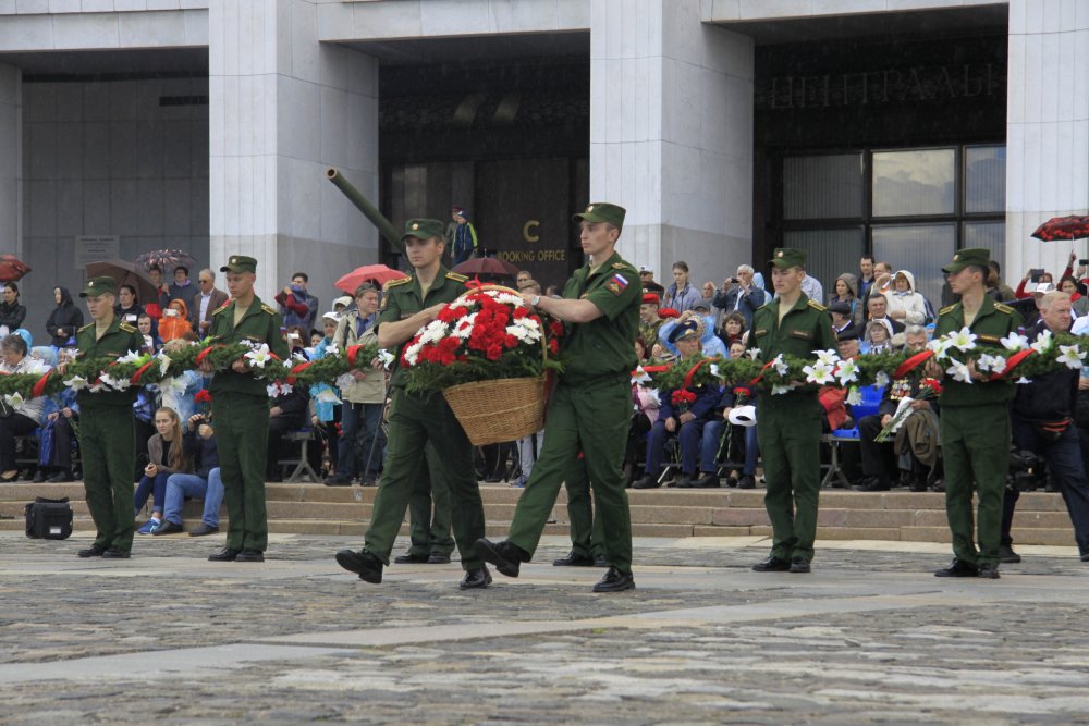 Память павших в Великой Отечественной войне почтили минутой молчания… Затем под звуки государственного гимна в исполнении духового оркестра роты Почетного караула, гости и участники акции возложили цветочную гирлянду к Стеле Победы. И в момент возложения цветов начались капли дождя, будто небо проливает слезы о погибших.