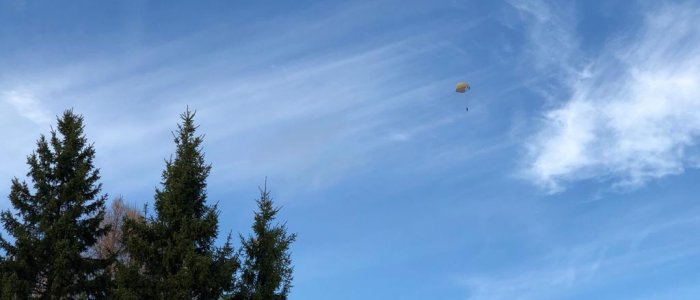 Высота - 800 метров, через три секунды свободного падения раскрывается купол - десантный парашют Д-6.