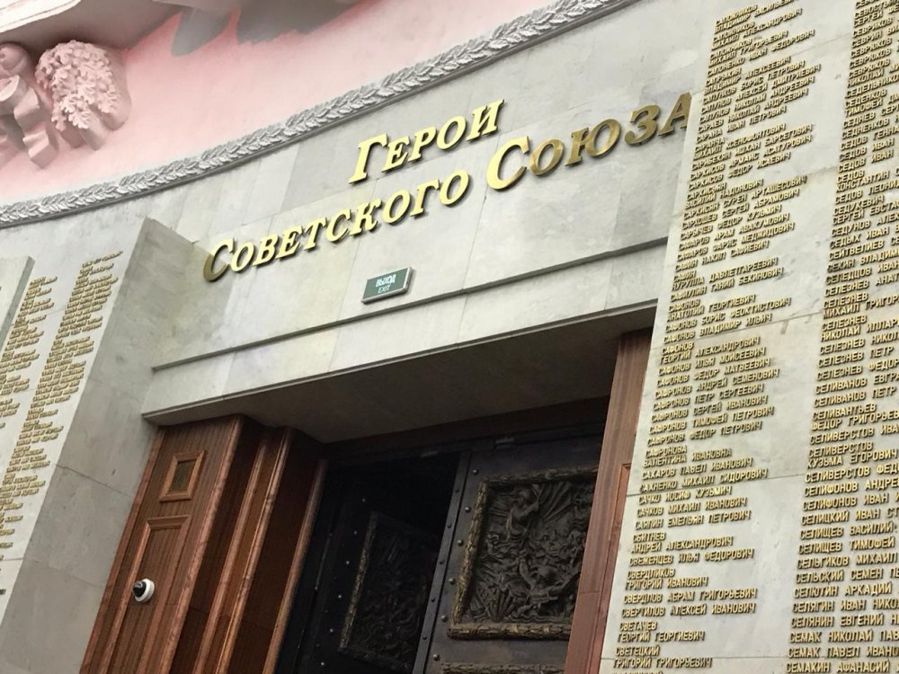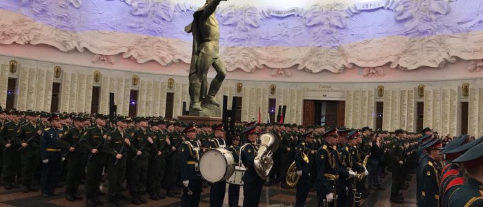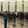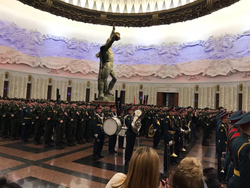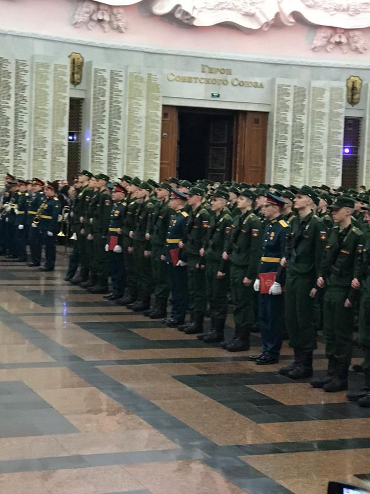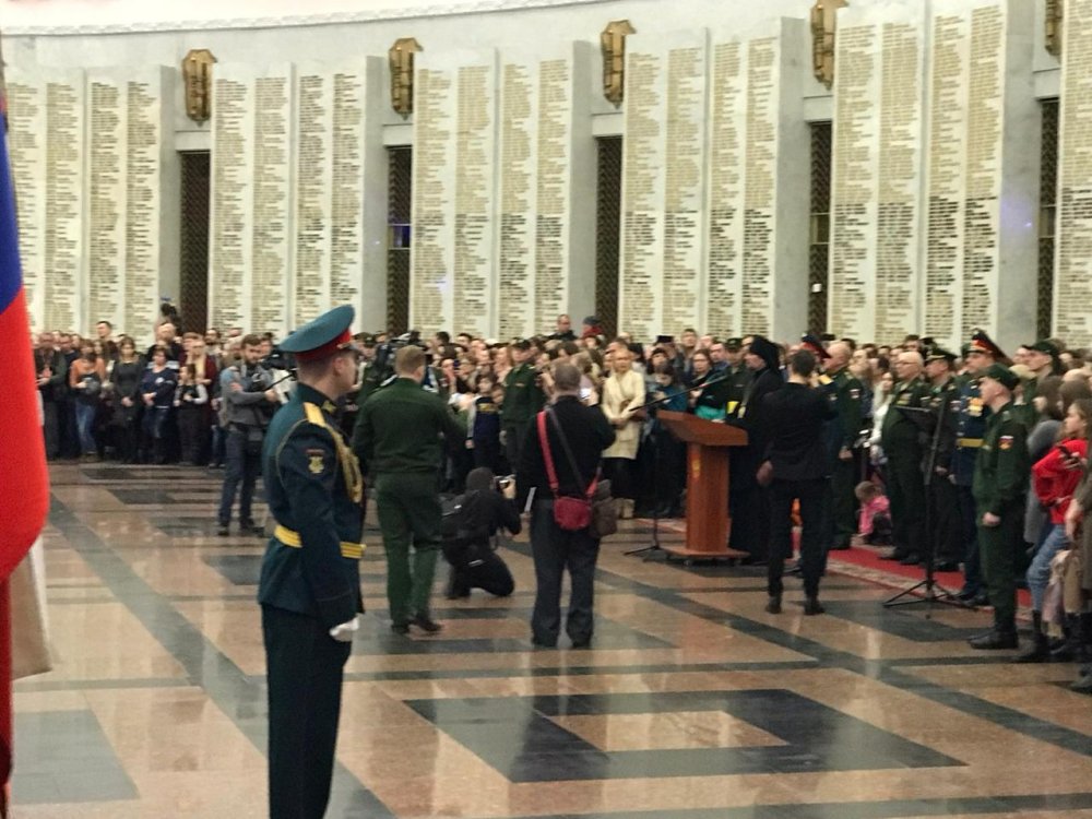 В зал, на стенах которого высечены фамилии почти 12 тысяч Героев Советского Союза, получивших это звание за подвиги в годы войны, внесли Боевое знамя полка и Государственный флаг Российской Федерации.