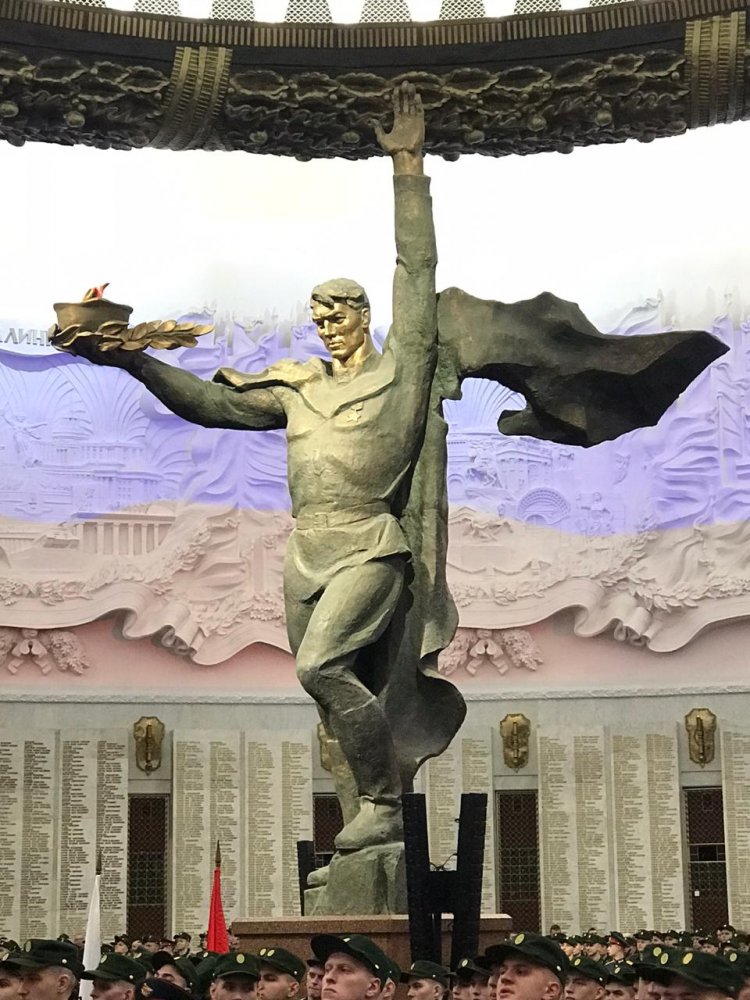 После церемонии принятия присяги военнослужащим показали светозвуковую инсталляцию "Дорога к Победе". Под куполом Зала Славы развернулись основные сражения Великой Отечественной войны.