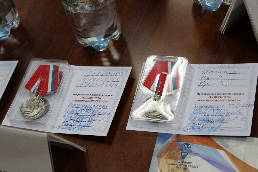 Большинство собравшихся за круглым столом люди, увлеченные парашютным спортом, прошедшие школу ДОСААФ ещё в далеком СССР. За плодотворное участие в Проекте и в развитии парашютного спорта, Председатель ДОСААФ города Москвы В.И. Ниниченко вручил активным участникам проекта благодарности и памятные медали «За верность парашютному спорту».