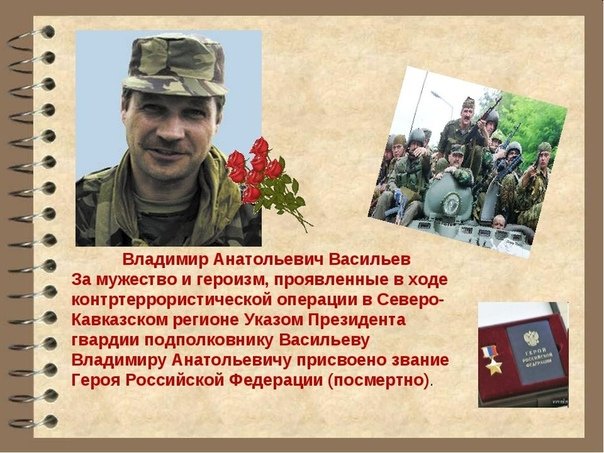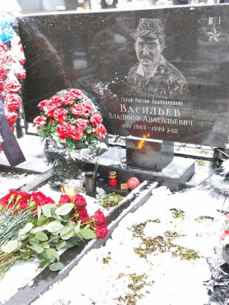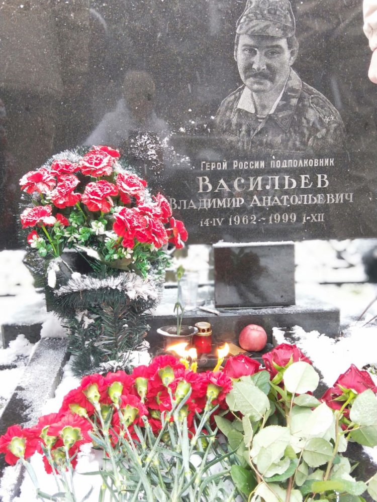 В бою 1 декабря 1999 года в районе поселка Первомайский на подступах к Грозному боевиками была окружена одна из рот полка. Ей грозило полное уничтожение. Гвардии подполковник Васильев организовал срочную переброску подразделений в район боя. Хотя численность боевиков превышала спешно собранные Васильевым силы, он организовал атаку противника и лично возглавил эту операцию. В ожесточенном бою против засевших в укрепленных позициях боевиков удалось прорвать кольцо окружения. Атакующие мотострелки понесли довольно значительные потери, но боевую задачу выполнили. Oкруженная рота вышла к своим, были эвакуированы все раненые и погибшие. Уже в самом конце боя гвардии подполковник Васильев был убит выстрелом вражеского снайпера. За мужество и героизм, проявленные в ходе контртеррористической операции в Северо-Кавказском регионе Указом Президента Российской Федерации № 599 от 28 марта 2000 года гвардии подполковнику Васильеву Владимиру Анатольевичу присвоено звание Героя Российской Федерации (посмертно) |