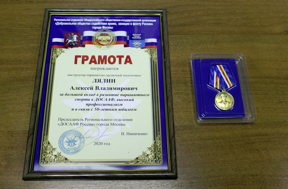 21 декабря 2020 года Председатель ДОСААФ города Москвы В.И. Ниниченко наградил инструктора Московского городского Аэроклуба ДОСААФ А.В. Лялина памятной медалью и грамотой за вклад в развитие парашютного спорта.