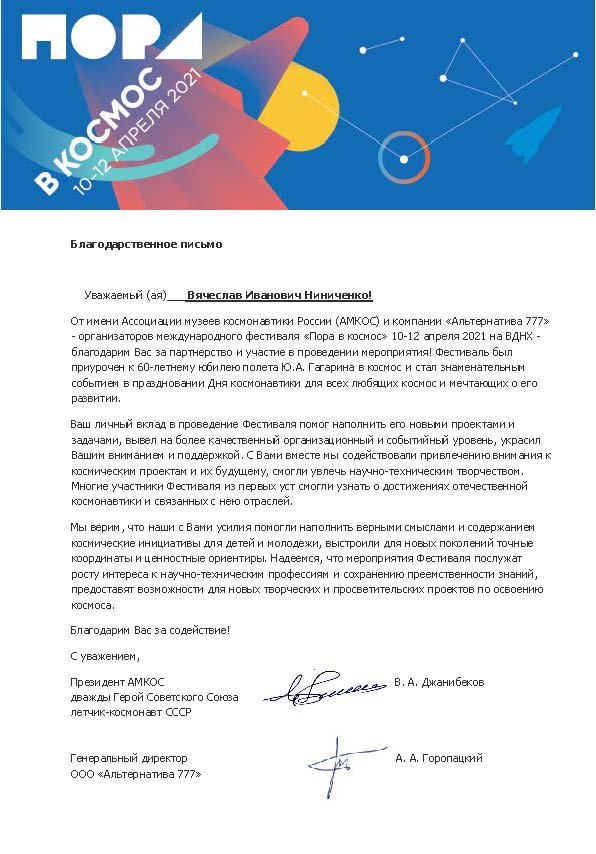 15 апр.Президент Ассоциации музеев космонавтики России, дважды Герой Советского Союза, лётчик-космонавт СССР В.А. Джанибеков выразил благодарность ДОСААФ города Москвы в лице Председателя В.И. Ниниченко за партнерство и участие в проведении международного фестиваля «Пора в космос», проходившего с 10 по 12 апреля 2021 года на ВДНХ.