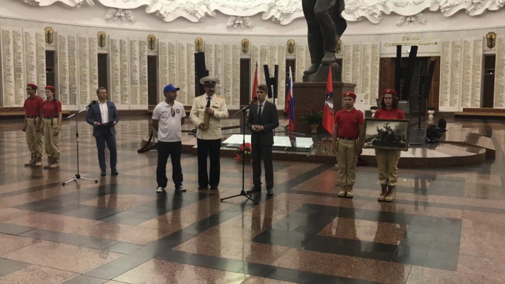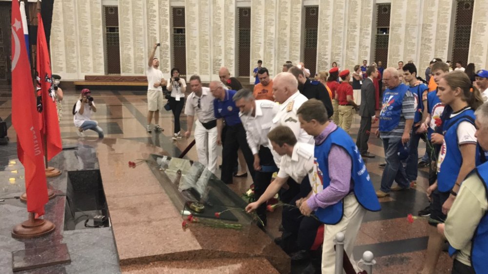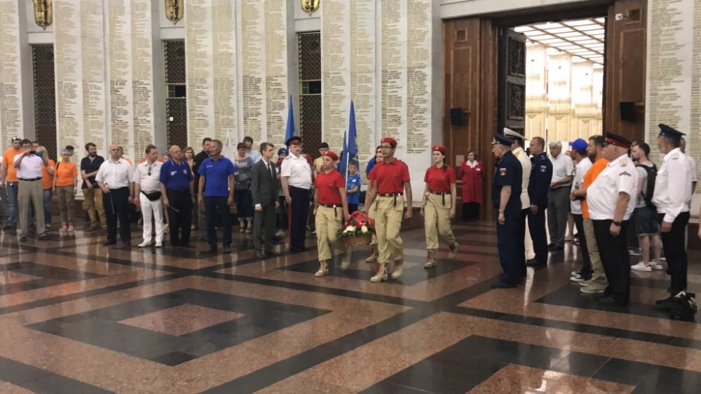 После возложения слово взял председатель Молодежного комитета Музея Победы Павел Кудрявцев – «ДОСААФ уже 90 лет воспитывает из молодежи настоящих героев. Это кузница патриотов, из которых вышли 342 героя Советского Союза чьи имена увековечены на стенах Зала Славы Музея Победы. История Победы и история ДОСААФ неразрывны. Мы очень рады, что масштабный всероссийский автопробег «С Востока на Запад России» совершил остановку именно здесь в таком знаковом и значимом месте. От Музея Победы в знак дружбы и солидарности хотели бы передать братскому белорусскому народу частицу святой земли с Поклонной горы».
