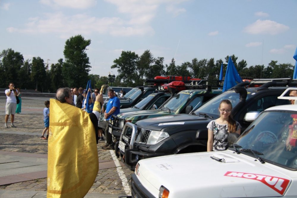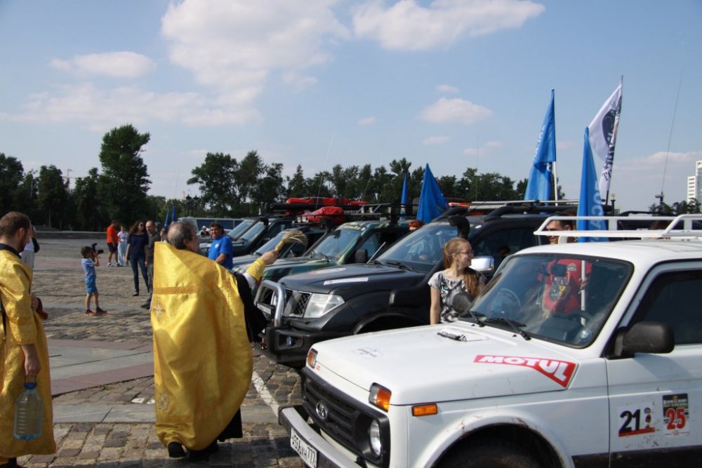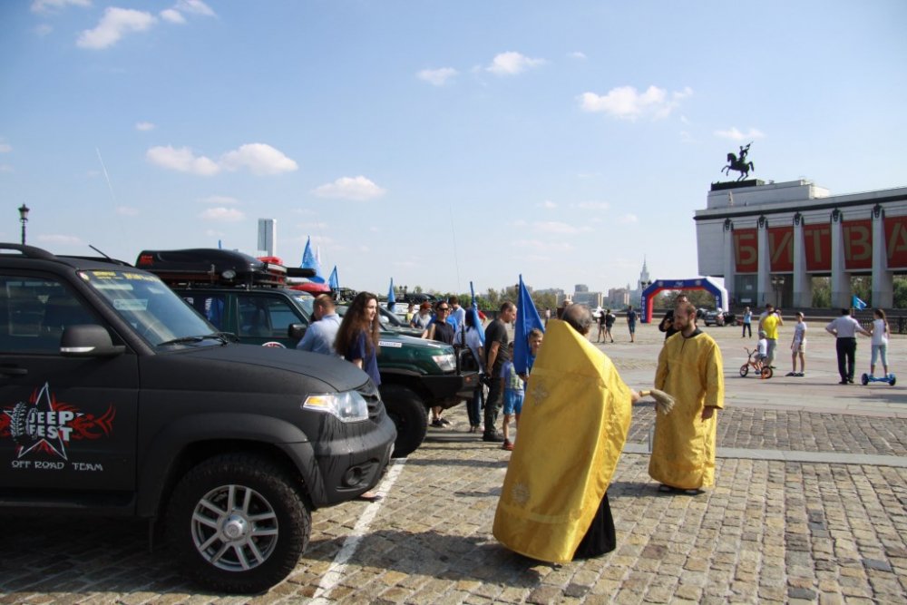 На площади Музея Победы был проведен молебен и благословение участников «Дорожного ралли» и их автомобилей священником храма Святого Великомученика Георгия Победоносца Вадимом Никулиным.