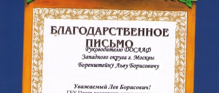 12 янв.Директор Центра поддержки семьи и детства СЗАО города Москвы Ирина Ивановна Ветчинникова вручила руководителю местного отделения ДОСААФ ЗАО города Москвы Льву Борисовичу Боренштейну благодарственное письмо.