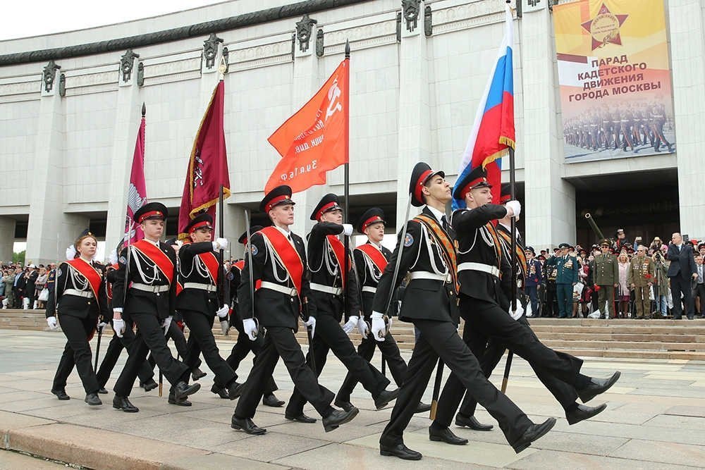 Парад кадет был отмечен особенно ярким и масштабным событием - 24,5 тыс. его участников хором спели гимн Москвы, установив рекорд России и Европы». Участники парада пронесли копию Знамени Победы, врученную московским кадетам ветеранами войны. В парадном строю по брусчатке Поклонной горы прошли более 2,5 тыс. кадетов.