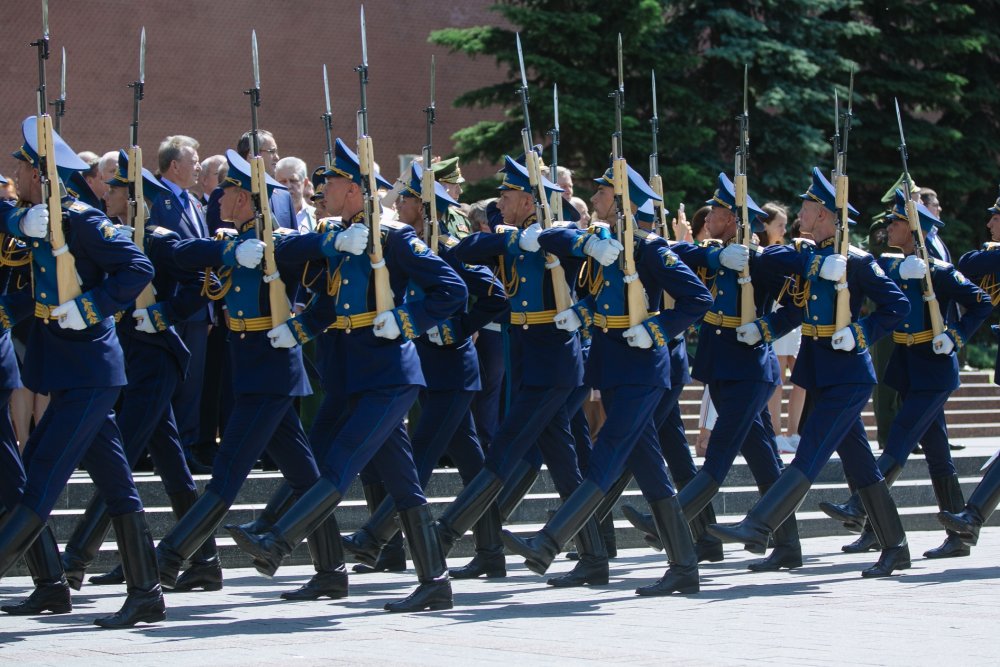 В ходе церемонии возложения венков и цветов к Могиле Неизвестного солдата прошел маршем батальон почетного караула.
