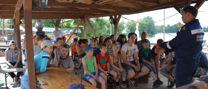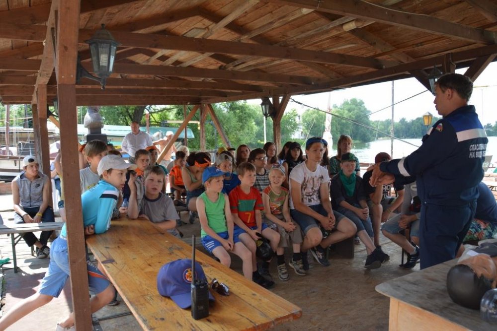 Водные спасатели продемонстрировали основные средства спасения и научили ребят использовать спасательный круг и спасательные жилеты и конец Александрова.