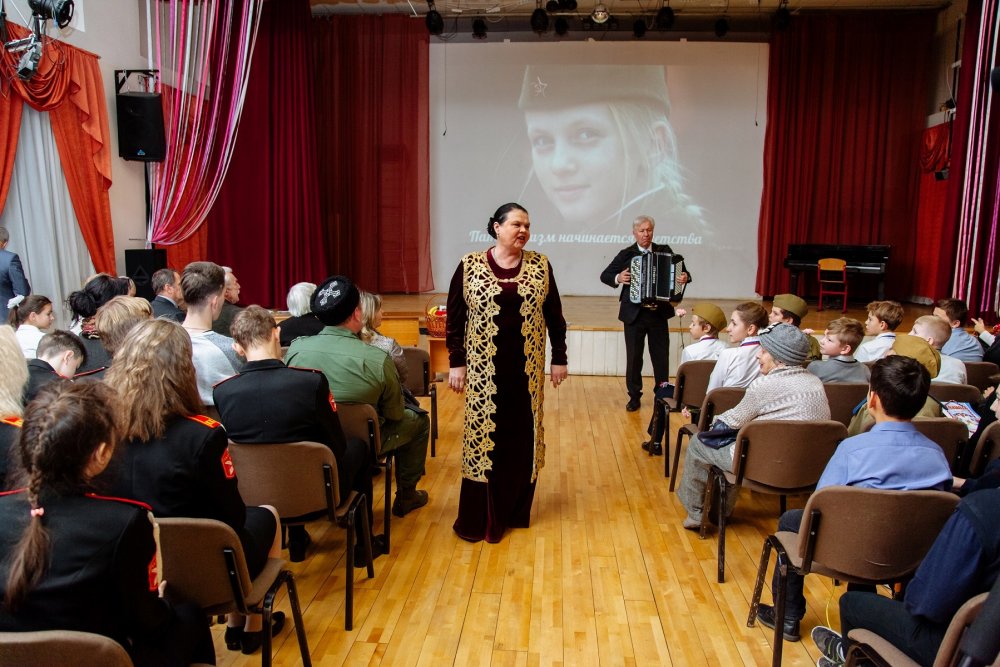 Кульминацией встречи стал концерт перед ветеранами и школьниками на котором выступили солист и руководитель музыкальной группы «Царицынский Парк» майор полиции в отставке Игорь Огурцов и народная артистка России Наталья Борискова.