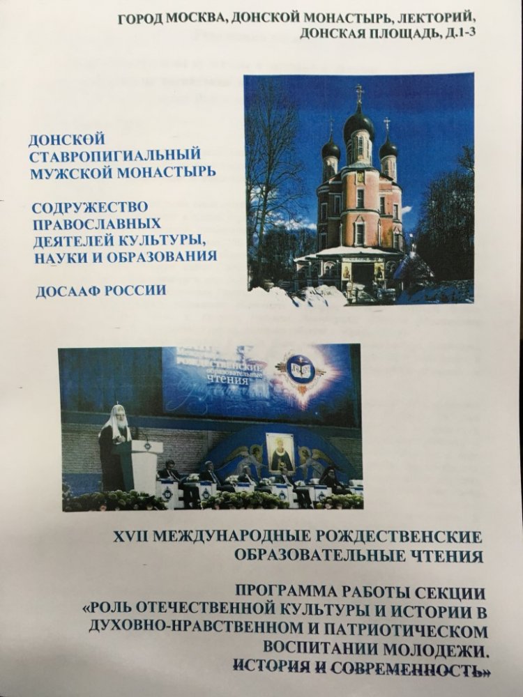 30 янв.В рамках Международных Рождественских образовательных чтений в направлении «Церковь и культура» 29 января в Донском монастыре прошла секция «Роль отечественной культуры и истории в духовно – нравственном и патриотическом воспитании молодежи. История и современность», в котором приняли участие сотрудники ДОСААФ г. Москвы и члены юнармейского движения.