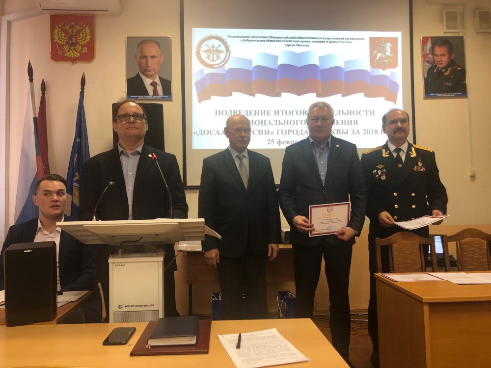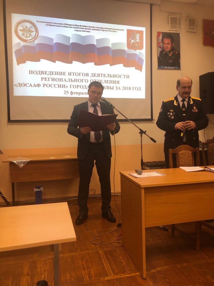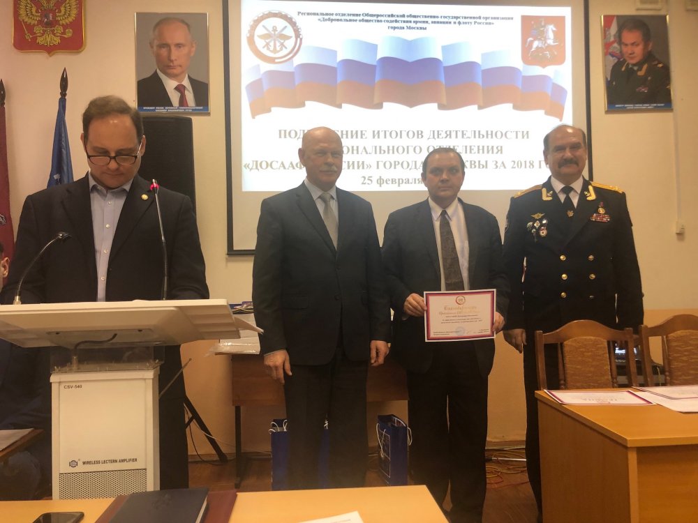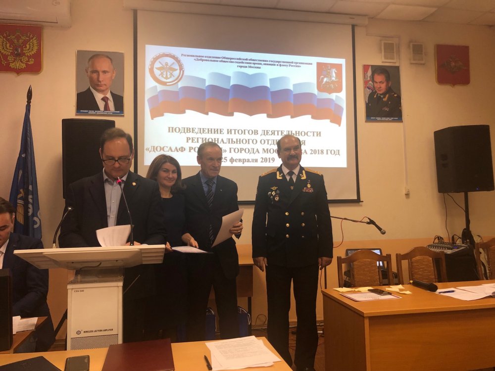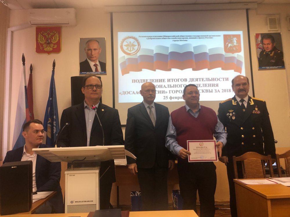 В своем выступлении первый заместитель Председателя ДОСААФ России Малев Л.И. поздравил Региональное отделение ДОСААФ Москвы с почетным Первым местом среди Региональных отделений ДОСААФ России по итогам работы за 2018 год и назвал сотрудников ДОСААФ Москвы лучшими из лучших.