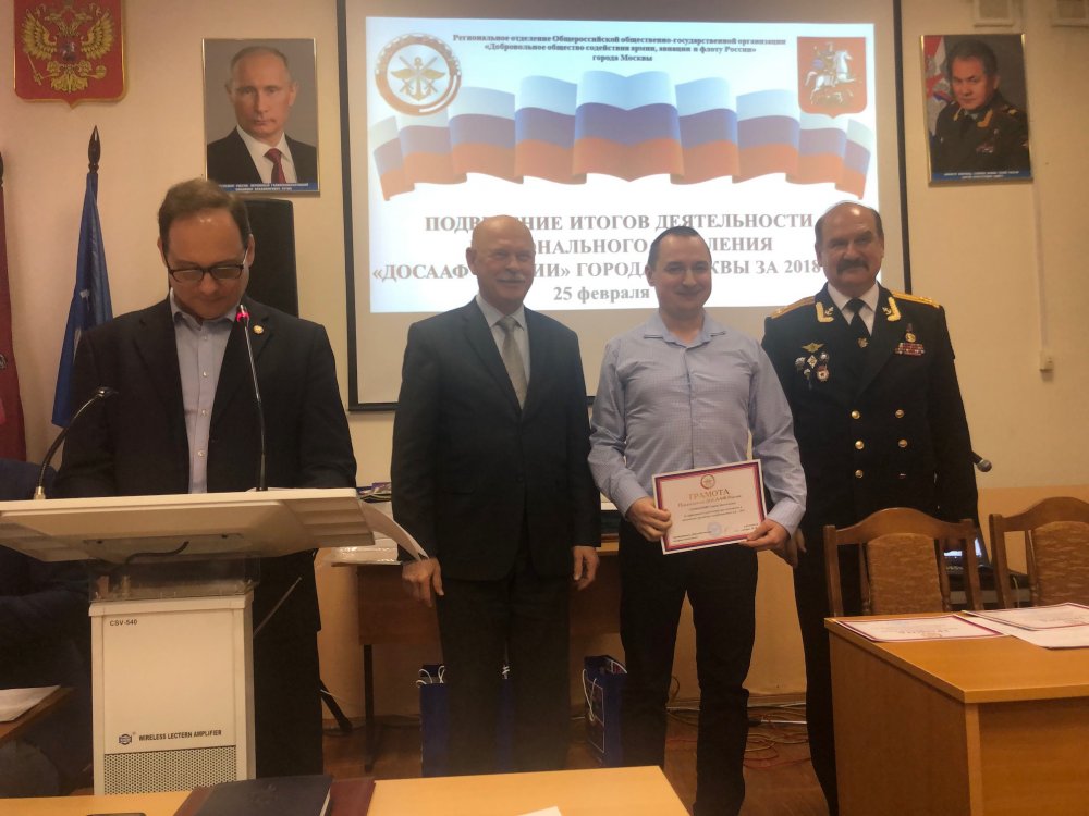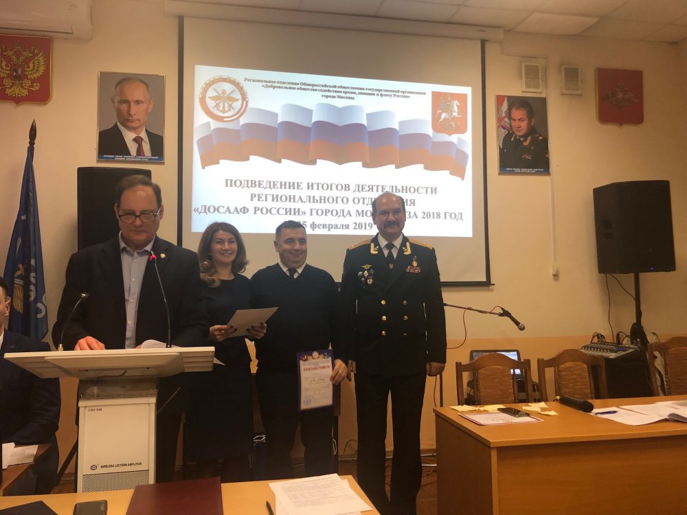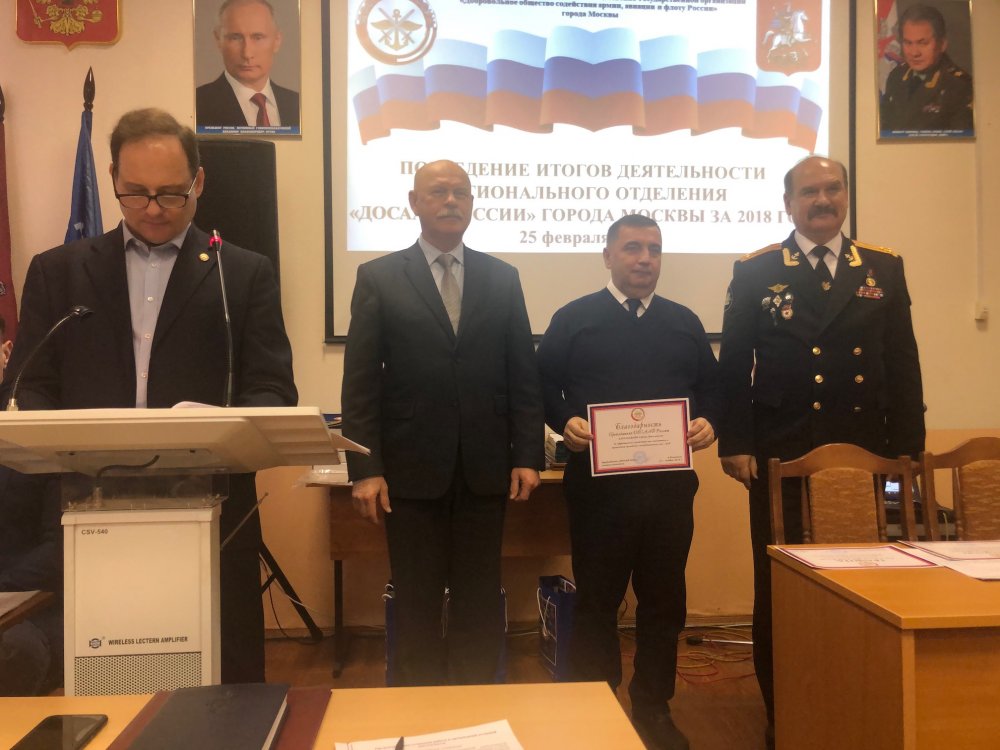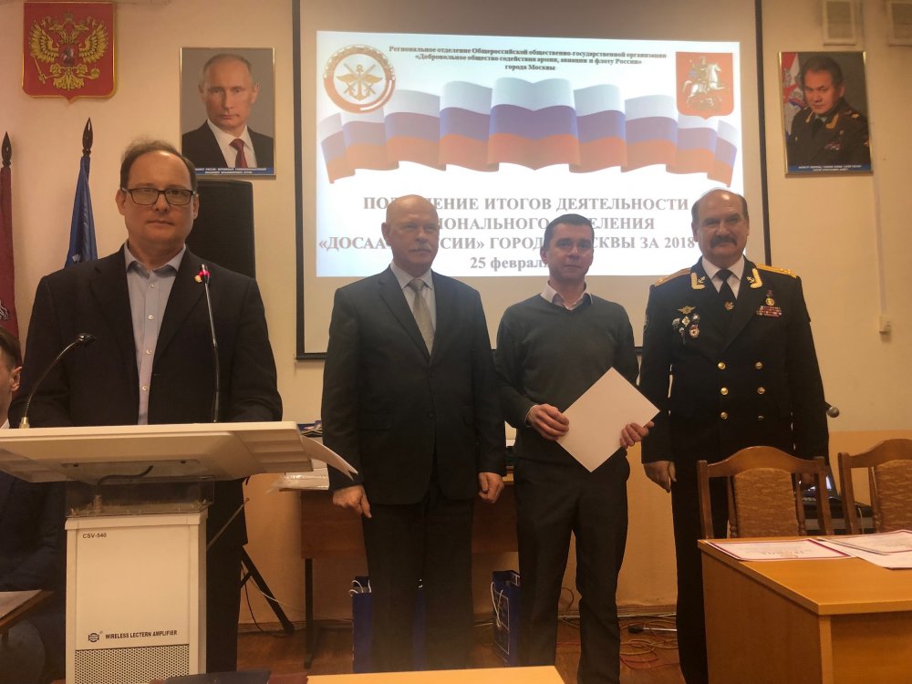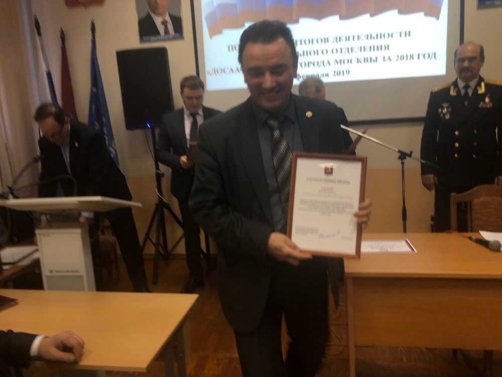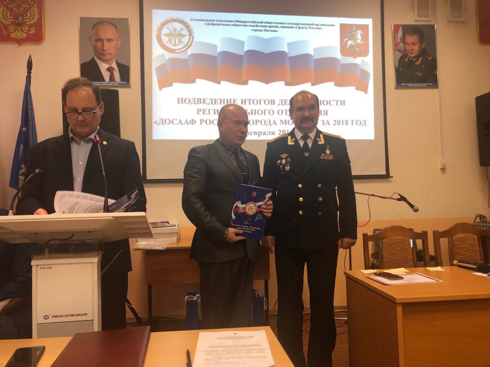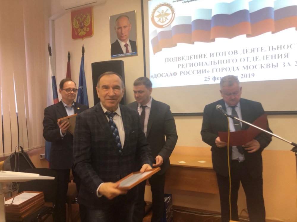 Приказами Председателя ДОСААФ России А.П. Колмакова, руководителя Департамента региональной безопасности и противодействия коррупции города Москвы В.В. Регнацкого, Председателя Регионального отделения «ДОСААФ России» города Москвы В.И. Ниниченко были поощрены работники подразделений ДОСААФ Москвы, наиболее отличившиеся при выполнении государственных задач, стоявших перед оборонной организацией города Москвы в 2018 году.