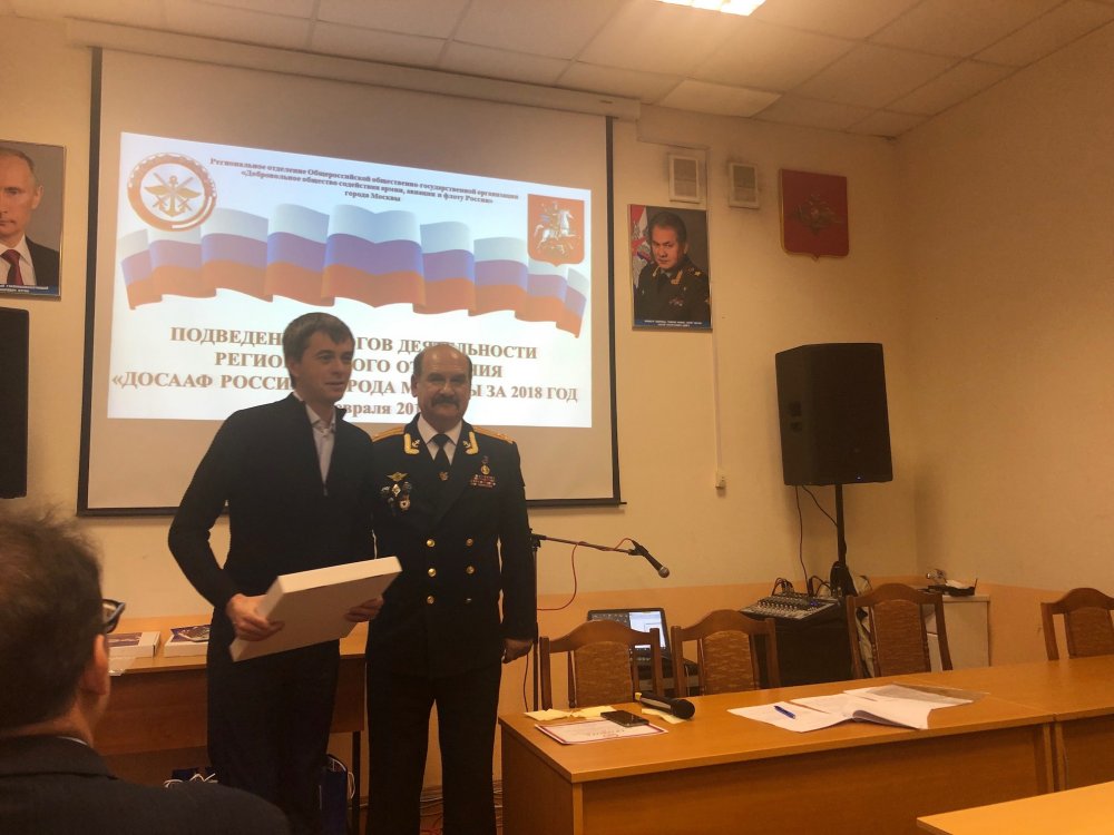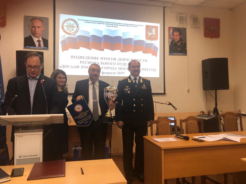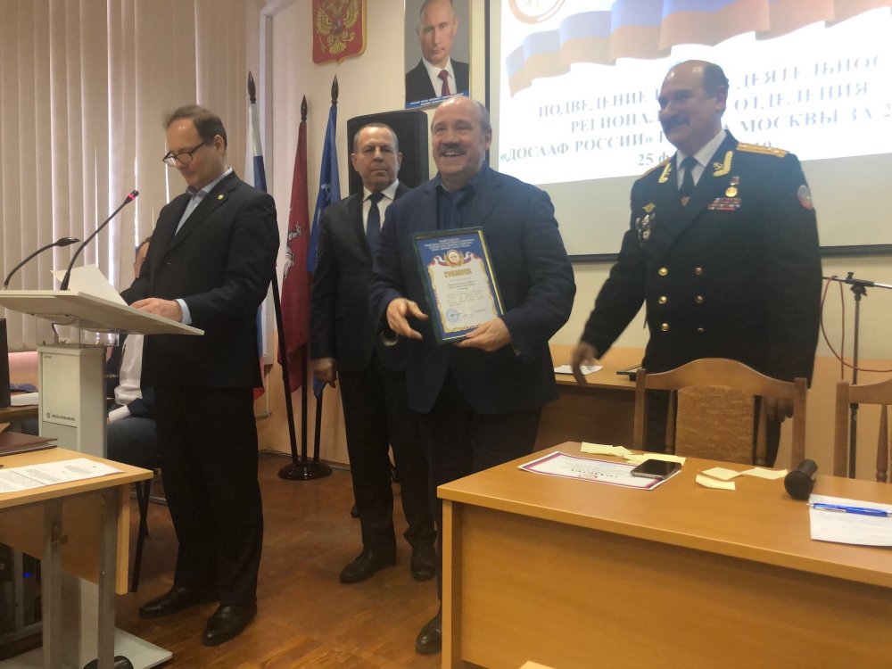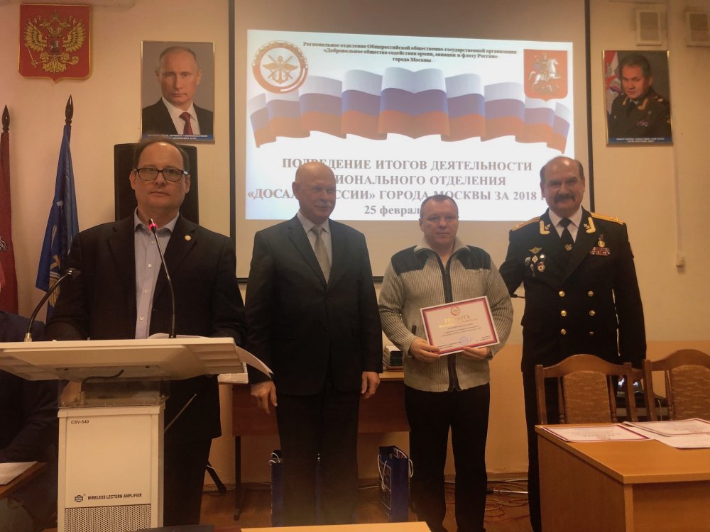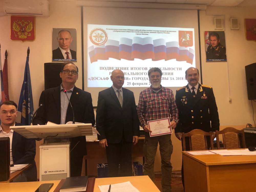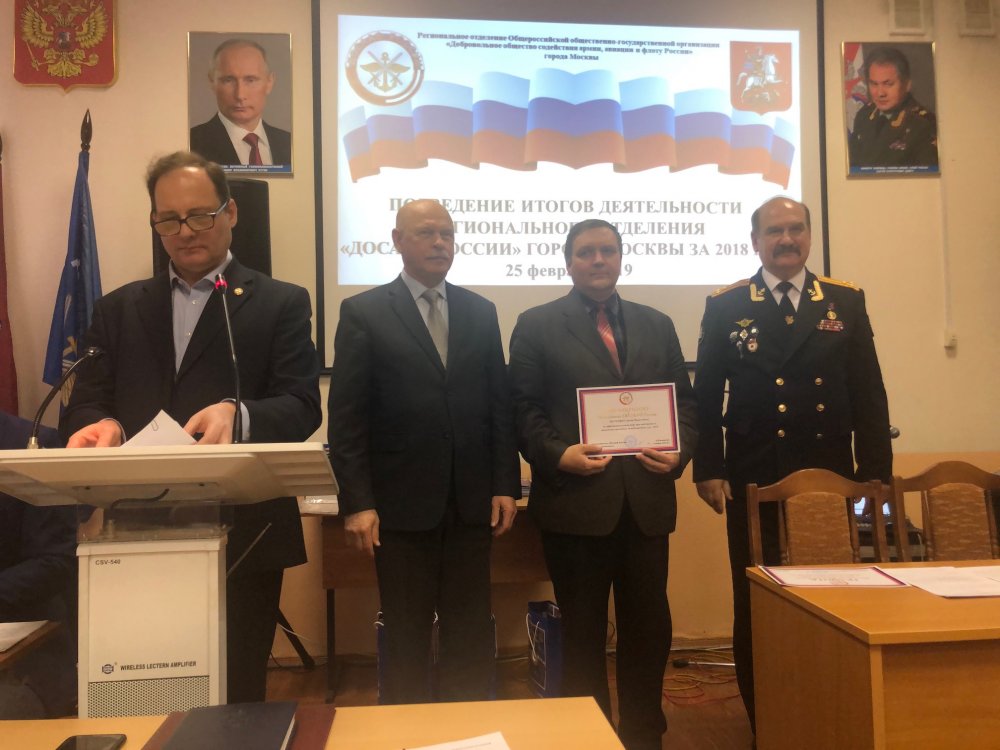 Приказами Председателя ДОСААФ России А.П. Колмакова, руководителя Департамента региональной безопасности и противодействия коррупции города Москвы В.В. Регнацкого, Председателя Регионального отделения «ДОСААФ России» города Москвы В.И. Ниниченко были поощрены работники подразделений ДОСААФ Москвы, наиболее отличившиеся при выполнении государственных задач, стоявших перед оборонной организацией города Москвы в 2018 году.